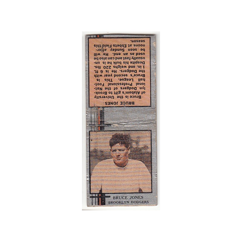This is a 1933 Diamond Matchbook of Bruce Jones.  It has no striker and is in P condition. It has some glue residue on the back.