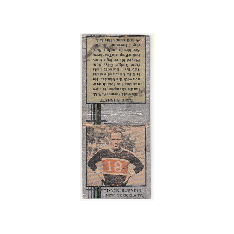 This is a 1933 Diamond Matchbook of Dale Burnett. It has no striker and is in P condition. It has chips and ink marks on the front, and glue residue on the back.