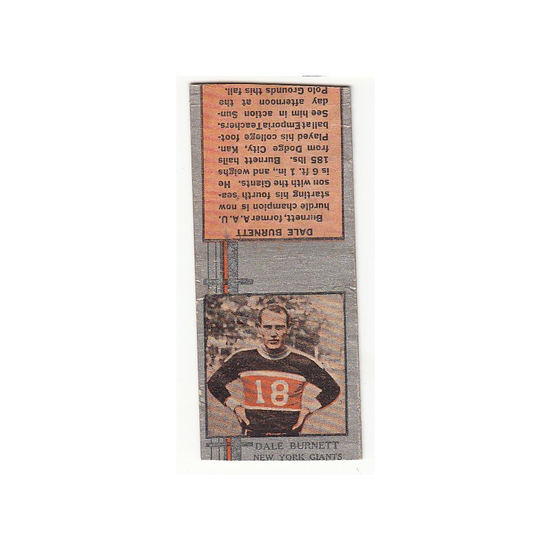 This is a 1933 Diamond Matchbook of Dale Burnett. It has no striker and is in P condition. It has glue residue on the back, and some of the coloring is faded.