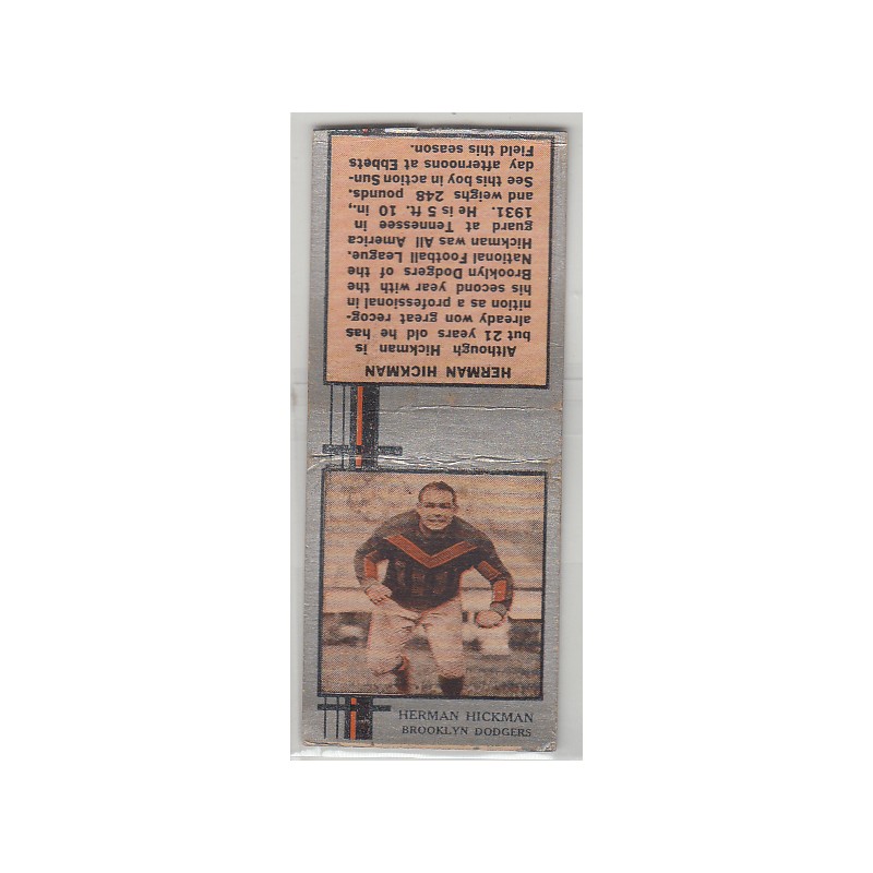 This is a 1933 Diamond football matchbook of Herman Hickman. It is missing the striker, and is in VG condition