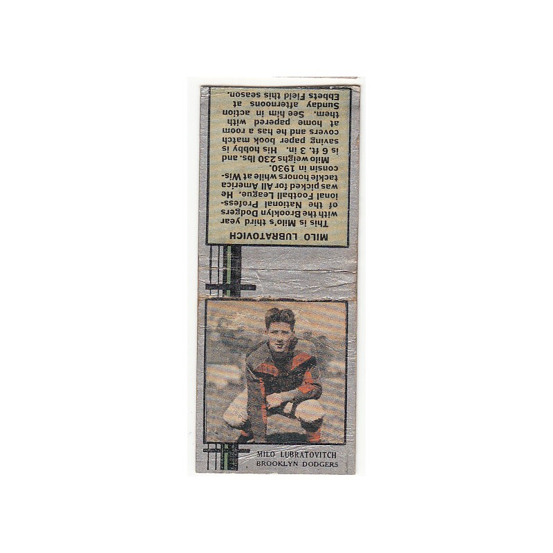 This is a 1933 Diamond Matchbook of Milo Lubratovich. It is in G+ condition, and has no striker.