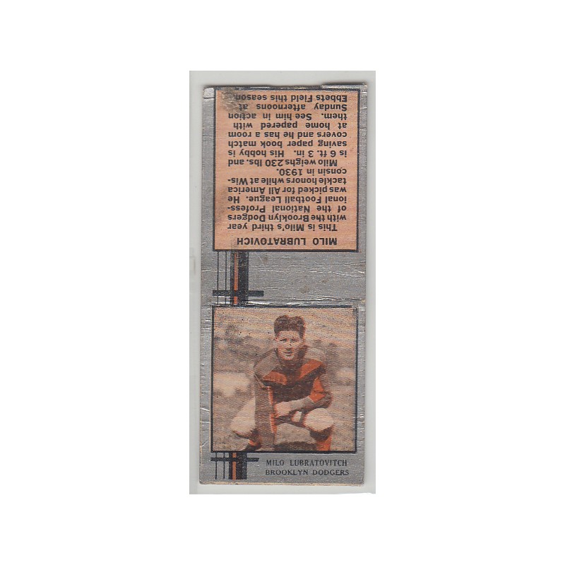 This is a 1933 Diamond football matchbook of Milo Lubratovitch. It is missing the striker, and is in G+ condition.