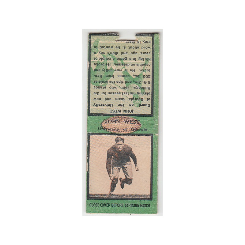 This is a 1934 Diamond football matchbook of John West. It is missing the striker, and has a green background. It is in G condition.
