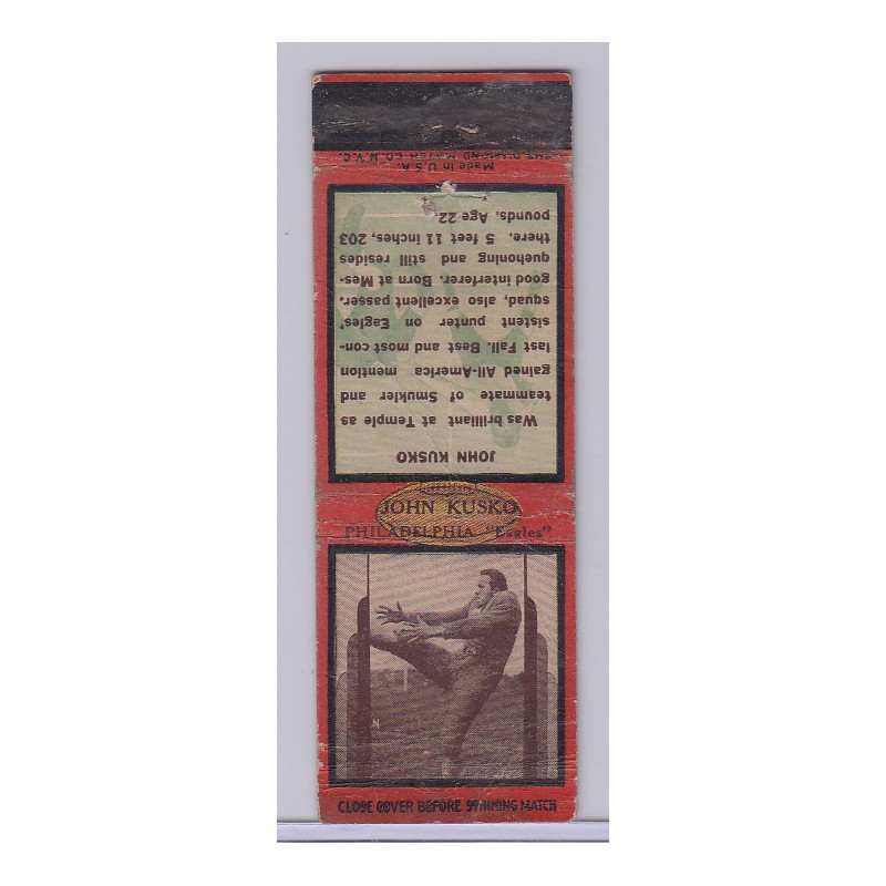 This is a 1936 Diamond football matchbook of John Kusko. It is red, and has the striker. The matchbook is in F condition.